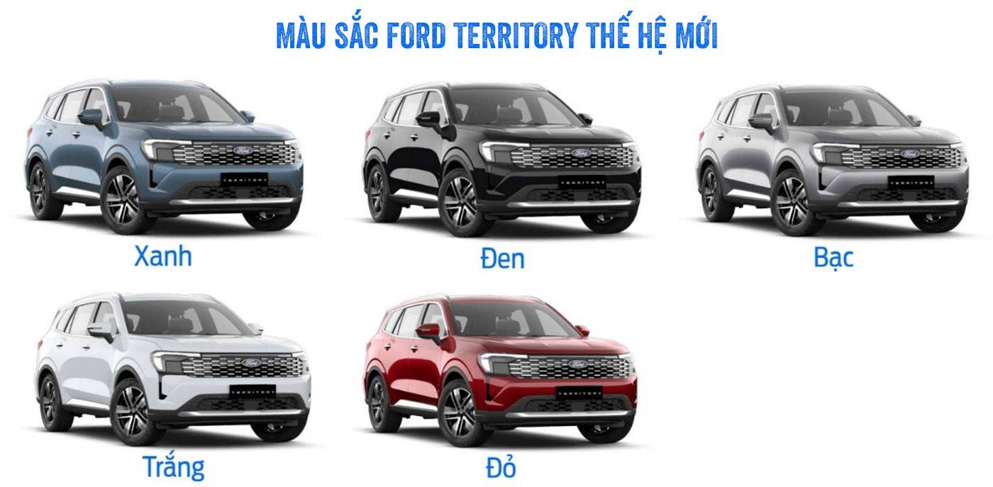 Ford Territory 2025 tại thị trường Việt Nam được bán với 5 lựa chọn màu sắc ngoại thất chính, bao gồm: Trắng - Đen - Xanh - Bạc - Đỏ.